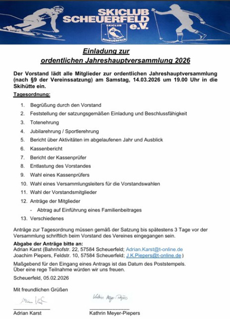 Bei Interesse schreibt einfach eine E-Mail an skiclub-scheuerfeld@outlook.de oder kontaktiert einfach ein Vorstandsmitglied.