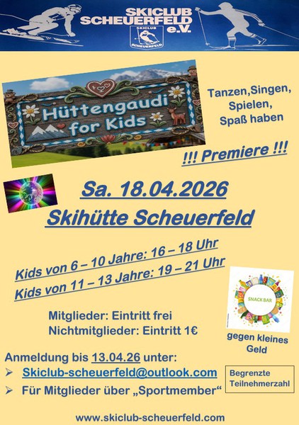Am 18.04.26 veranstaltete der Skiclub Scheuerfeld zum ersten Mal die Scheuerfelder „Hüttengaudi for Kids“. Rund 35 Kinder feierten und tanzten in der Skihütte ausgelassen zu den angesagtesten Kinderdisco-Hits. Neben Hits wie „Wackelpuddinggeschmack“, „Boom Schakkalakka“ und „Dorfkinder“ durften auch diverse Karnevals- sowie Après-Ski-Hits nicht fehlen.